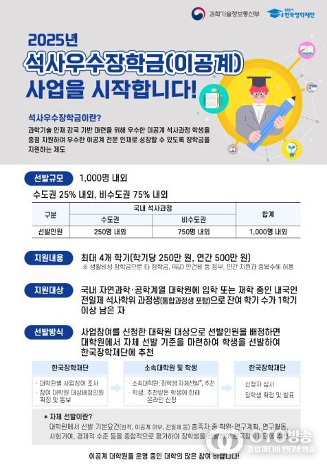 oto방송 김민석 기자 | 과학기술정보통신부와 한국장학재단은 2025년도 이공계 석사우수장학금 장학사업을 올해 처음으로 시행한다고 밝혔다. 이공계 석사우수장학금은 사업 참여 신청을 한 대학원의 소속 학생 중 장학생을 선발하며, 대학원 사업 참여 신청 기간은 9월 19일부터 10월 2일까지이다.