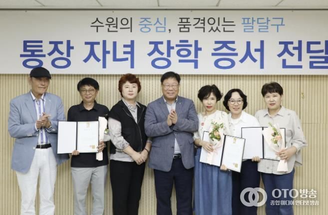 oto방송 김민석 기자 | 수원시 팔달구는 지난 9월 19일 구청 상황실에서 ‘2025년 하반기 통장자녀 장학증서 전달식’을 통해 관내 통장들의 자녀에게 장학금을 전달했다.