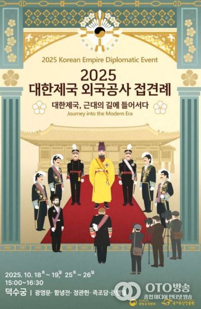 oto방송 김민석 기자 | 국가유산청 궁능유적본부는 국가유산진흥원과 함께 10월 18일~19일, 25일~26일 오후 3시 덕수궁(서울 중구)에서 고종 황제가 외국공사를 접견하는 의례와 연회를 재현한 공연 '2025년 대한제국 외국공사 접견례'를 개최한다.