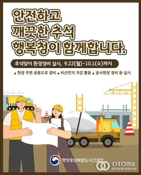 oto방송 김민석 기자 | 행정중심복합도시건설청은 다가오는 추석을 앞두고 9월 22일부터 10월 1일까지 행복도시 건설현장 환경정비를 추진한다.