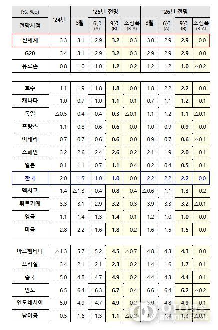향후 세계경제 성장률은 ’25년 3.2%(’25.6월 전망 대비 +0.3%p), ’26년 2.9%(’25.6월 전망과 동일)를 기록할 것으로 전망했으며, 올해 하반기에는 조기선적 효과가 감소하고 관세 인상과 높은 정책 불확실성이 투자와 무역을 위축시키면서 성장세가 둔화될 것으로 예상했다.