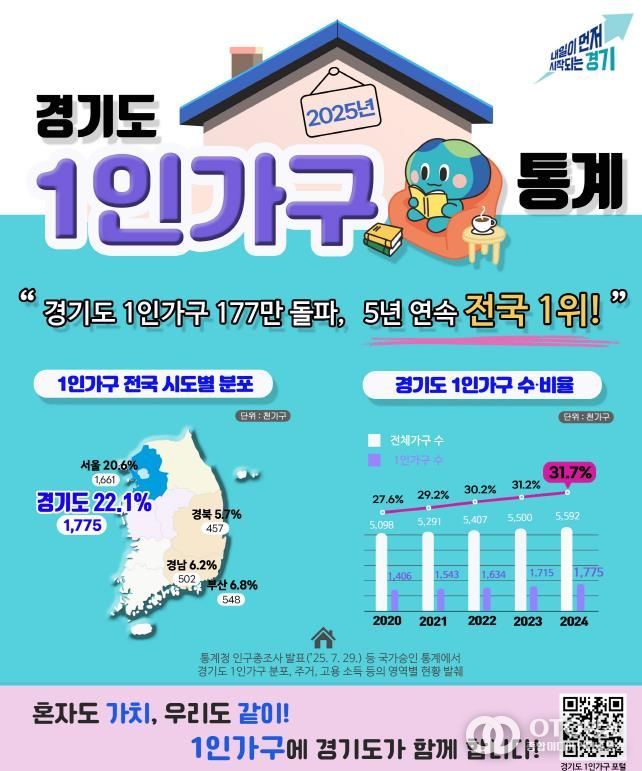 oto방송 김민석 기자 | 경기도 1인가구는 177만 가구이며, 도 전체 가구 가운데 31.7%를 차지하고 있는 것으로 나타났다. 경기도의 1인가구 수는 2020년부터 매년 전국 최고치를 경신하고 있다.