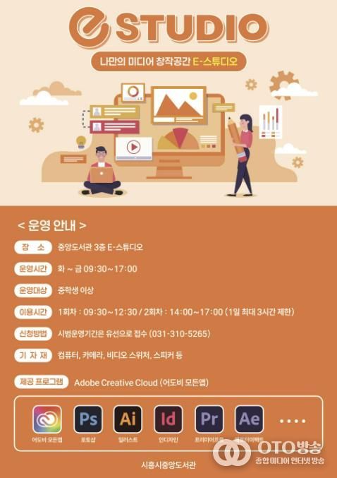oto방송 김민석 기자 | 시흥시중앙도서관은 시민들의 미디어 창작활동을 적극 지원하기 위해 도서관 3층에 위치한 e-스튜디오에 어도비 크리에이티브 클라우드(Adobe Creative Cloud)를 도입해 오는 9월 25일부터 시범 운영을 시작한다.