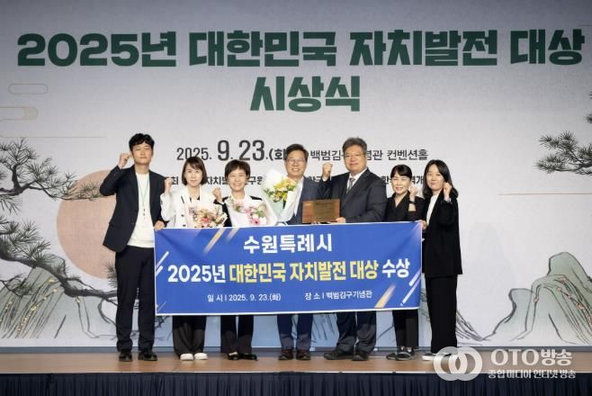 oto방송 김민석 기자 | 수원특례시가 (사)한국자치발전연구원 주관 ‘2025년 대한민국 자치발전대상’에서 기초자치 부문 대상을 받았다. 시상식은 23일 백범김구기념관 컨벤션홀에서 열렸다.