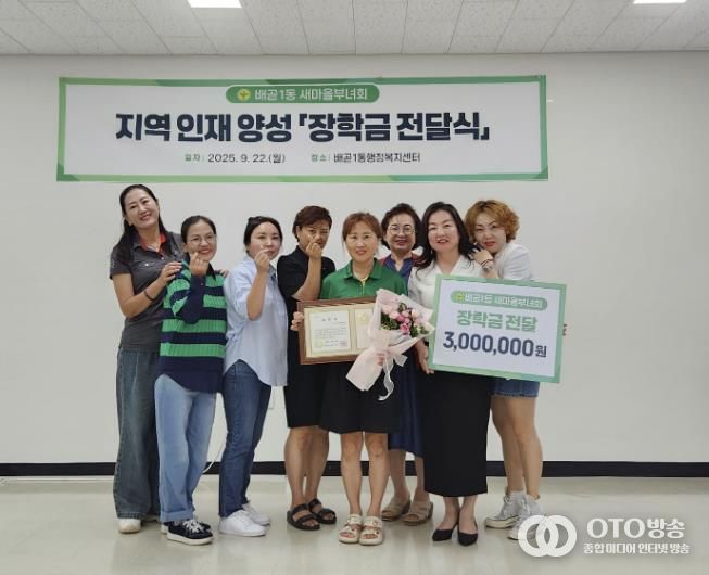 oto방송 김민석 기자 | 시흥시 배곧1동 새마을부녀회는 지난 9월 22일 배곧1동 행정복지센터에서 지역 인재 양성을 위한 장학금 전달식을 하고, 관내 거주 중고등학생 3명에게 각각 100만 원씩, 총 300만 원의 장학금을 전달했다.