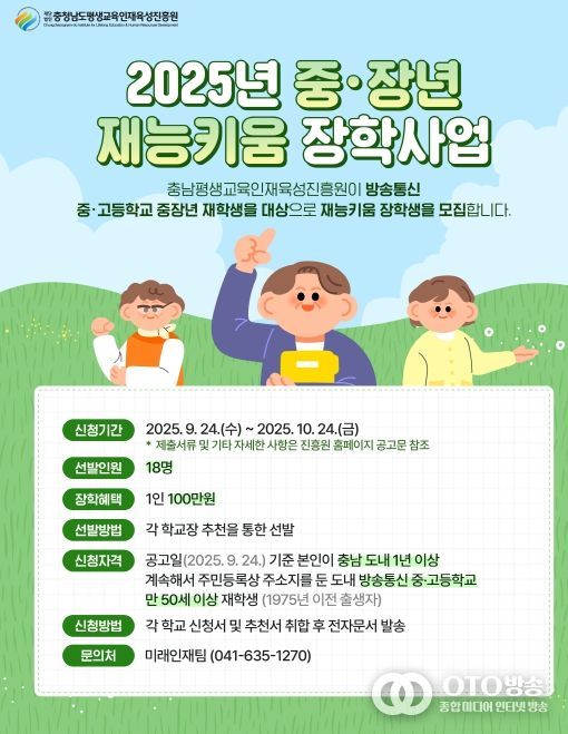 oto방송 김민석 기자 | 충청남도평생교육인재육성진흥원은 중장년층의 지속가능한 평생교육을 통해 학업 및 자기계발을 이루고, 나아가 인생 재설계를 지원 하기 위해 방송통신 중·고등학교 재학생을 대상으로 9월 24일부터 10월 24일까지 ‘2025년 중·장년 재능키움 장학생'을 모집한다.