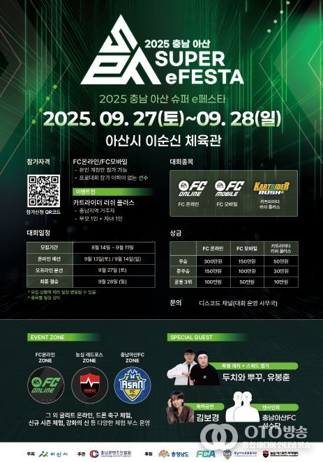 또한, 아산시 출신이자 올해 5월 아산시 홍보대사로 위촉된 가수 ‘김보경’의 축하 공연을 시작으로 FC 온라인 인기 인플루언서인 ‘두치와뿌꾸(안태은)’과 ‘유봉훈(유정훈)’, 충남아산FC 선수단들이 대회 현장을 찾아 이벤트 매치, 팬사인회, FC온라인 유저 스쿼드 평가 등 다양한 프로그램으로 현장 관람객들과 소통할 예정이다.