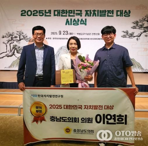 oto방송 김민석 기자 | 충남도의회 이연희 의원(서산3·국민의힘)이 23일 백범 김구 기념관에서 열린 '2025년 대한민국 자치발전 대상' 시상식에서 광역의회 의원부문 수상자로 선정됐다.