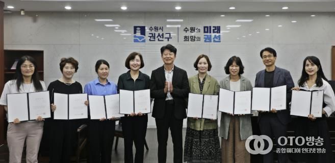 oto방송 김민석 기자 | 수원시 권선구는 지난 24일, 권선구청 구청장실에서 김종석 구청장을 비롯해 행정의 최일선에서 헌신·봉사하고 있는 통장 8명이 참석한 가운데 ‘2025년 하반기 통장자녀 장학금’전달식을 가졌다.