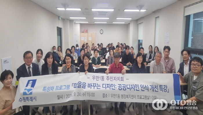 oto방송 김민석 기자 | 수원시 팔달구 우만1동 주민자치회는 지난 24일 우만1동 행정복지센터에서 특성화 프로그램의 일환으로 '마을을 바꾸는 디자인: 공공디자인 인식 개선 특강'을 진행했다.