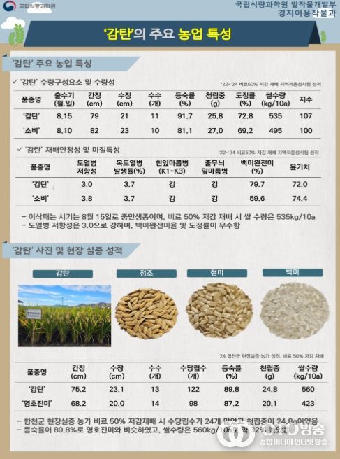 ‘감탄’은 비료 사용량을 절감하고 메탄 발생을 줄이는 그린라이스 품종으로, 비료를 50% 줄여도 수확량 감소가 약 7%에 불과하다. 밥맛이 우수하고 병해에도 강해 친환경 농업에 적합하다는 평가를 받고 있다.