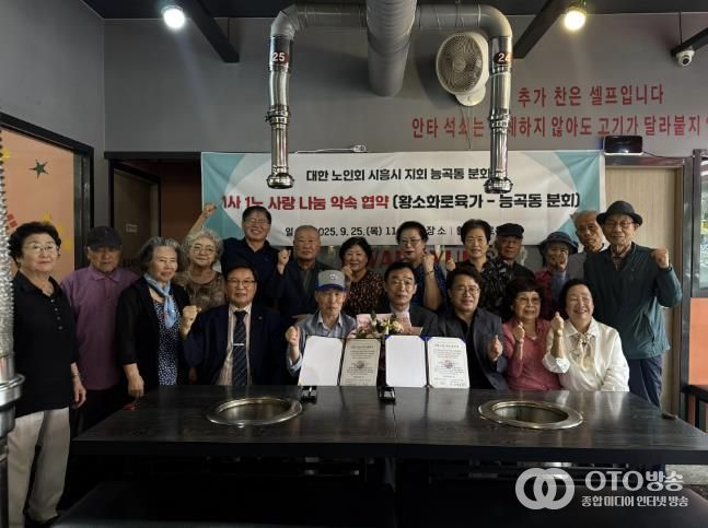 oto방송 김민석 기자 | 대한노인회 시흥시지회 능곡동분회와 황소화로육가 능곡직영점이 지난 9월 25일 능곡동 경로당 이용 어르신들의 복지 증진과 건강한 지역사회 조성을 위한 상호 협력 협약을 체결했다. 이날 협약식에는 김연규 대한노인회 시흥시지회장 등 30여 명이 참석했다.