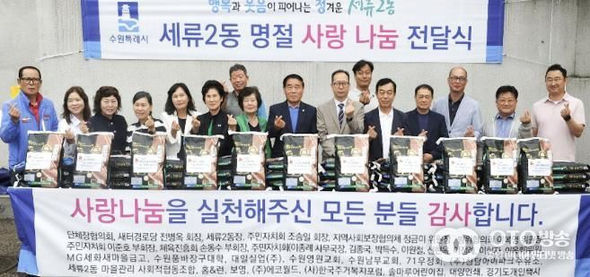 이번 전달식에는 △세류2동 주민자치회 △통장협의회 △새마을부녀회 △새마을문고회 △바르게살기위원회 △자유총연맹 △체육진흥회 △방위협의회 △지역사회보장협의체 △대일실업(주)가 참여했으며 지역 내 여러 기관과 개인들의 나눔도 더해졌다.