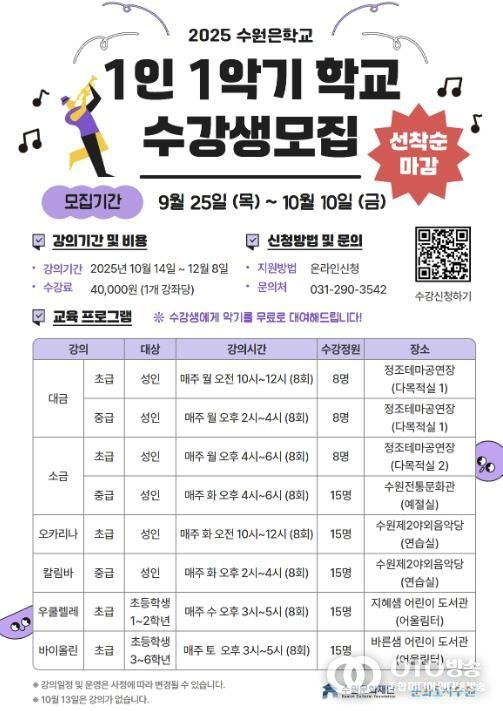 수원문화재단 관계자는 “평소 관심이 있던 악기를 직접 배우고 연주해 보며 일상에 예술적 감성을 더할 수 있는 계기가 되기를 기대한다”며, “악기를 처음 접하는 분들도 쉽게 참여할 수 있도록 초급과정과 악기 대여 서비스를 마련했으니, 많은 관심과 참여를 바란다”고 말했다.