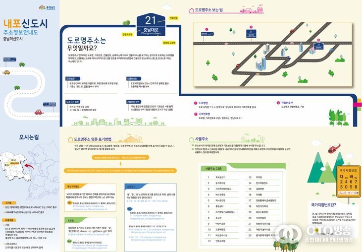 임택빈 도 토지관리과장은 “이번 도로명주소 안내도 배포로 내포신도시의 접근성과 이용 편의가 크게 향상될 것으로 기대되며, 위치 찾기 편의성과 행정 업무 활용성도 높아질 것”이라며 “앞으로 다국어 안내도 제작 등으로 외국인 방문객의 길 찾기에도 도움을 주고 도민의 다양한 요구를 반영해 최신 주소 정보를 지속적으로 제공할 것”이라고 말했다.