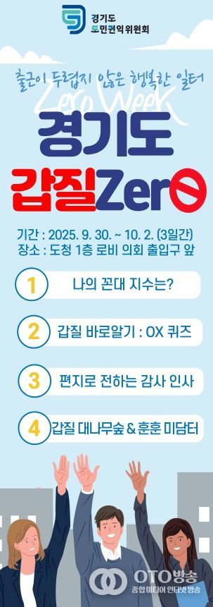 oto방송 김민석 기자 | 경기도 도민권익위원회는 9월 29일부터 10월 2일까지 ‘경기도 갑질 제로(Zero) 홍보주간’을 지정해 갑질 근절과 건강한 직장문화 조성을 위한 다양한 캠페인과 교육 프로그램을 추진한다.