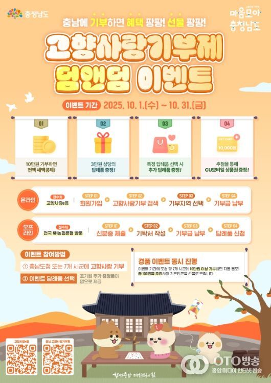 oto방송 김민석 기자 | 충남도는 천안·공주·보령·금산·서천·청양·예산 7개 시군과 10월 한 달간 ‘추석맞이 고향사랑 덤앤덤 이벤트’를 실시한다고 29일 밝혔다.