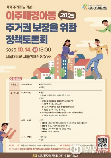 oto방송 김민석 기자 | 시흥시주거복지센터는 오는 10월 14일 오후 3시, 서울대학교 시흥캠퍼스 806호에서 ‘이주배경아동 주거권 보장을 위한 정책토론회’를 개최한다.