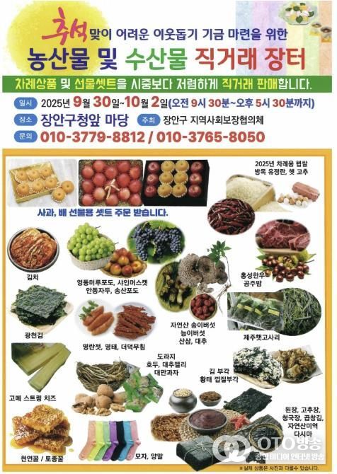 oto방송 김민석 기자 | 수원시 장안구 지역사회보장협의체는 민족 최대의 명절 추석을 맞아 오는 9월 30일부터 10월 2일까지 3일간 장안구청 앞 광장에서 ‘추석맞이 농수산물 직거래장터’를 개최한다.