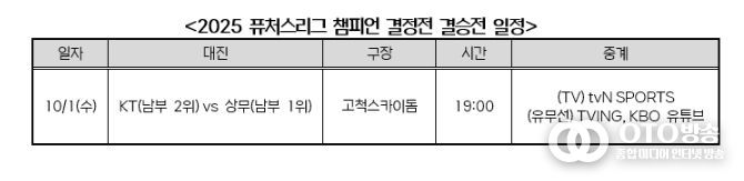 퓨처스리그 초대 챔피언이 결정될 결승전은 10월 1일(수) 오후 7시 고척스카이돔에서 열리며, 결승전은 TVING과 tvN SPORTS 및 KBO 유튜브를 통해 중계된다.