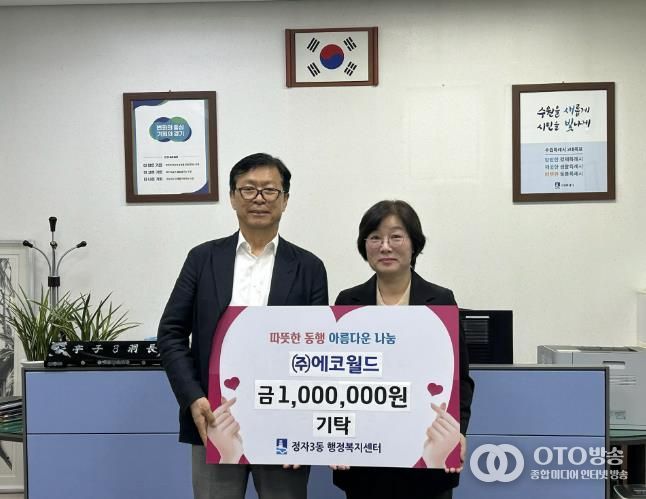 oto방송 김민석 기자 | 주식회사 에코월드는 지난 29일, 추석 명절을 앞두고 수원시 장안구 정자3동에 이웃돕기 성금 100만원을 기탁했다. 이번 기부금은 명절을 맞아 도움이 필요한 우리 이웃들에게 소중히 전달될 예정이다.