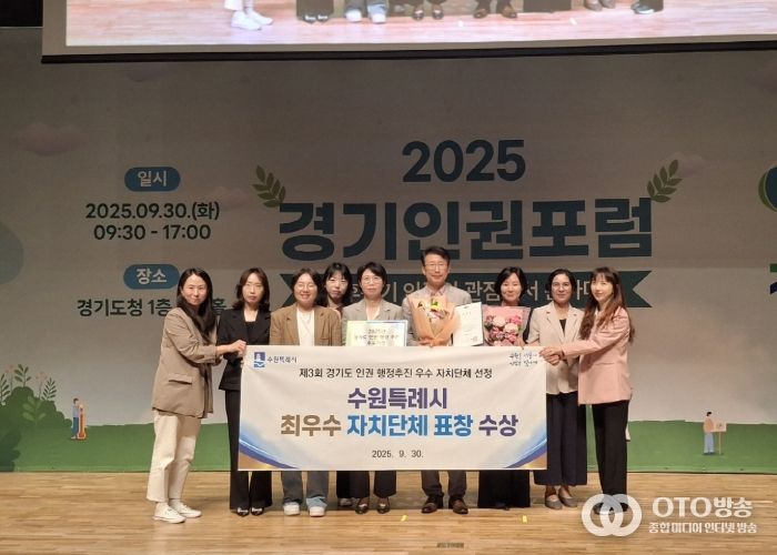 oto방송 김민석 기자 | 수원특례시가 제3회 경기도 인권행정 추진 우수 자치단체 평가에서 최우수상으로 선정되며 3년 연속 최우수상을 받는 성과를 거뒀다. 시상식은 9월 30일 경기도청 다산홀에서 열렸다.
