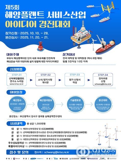 oto방송 김민석 기자 | 해양수산부와 선박해양플랜트연구소(소장 홍기용, KRISO)는 해양플랜트 서비스산업의 미래 혁신을 주도할 청년 인재를 발굴하기 위해 ‘제5회 해양플랜트 서비스산업 아이디어 경진대회’를 개최한다고 밝혔다.