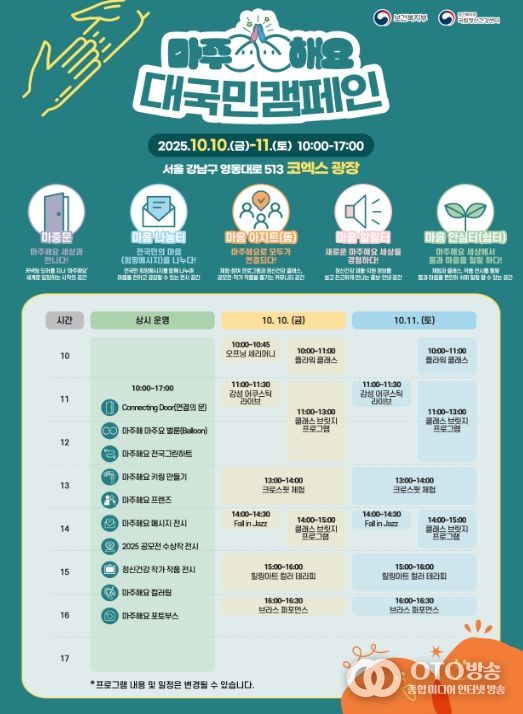 oto방송 김민석 기자 | 보건복지부와 국립정신건강센터는 ‘정신건강의 날’을 맞아 10월 10일에서 11일까지 양일간 서울 코엑스 야외광장에서 '마주해요! 대국민 캠페인'을 개최한다.
