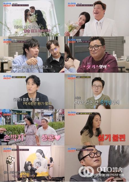oto방송 김민석 기자 | TV CHOSUN 극사실주의 다큐 예능 ‘조선의 사랑꾼’에서 '원진서' 윤정수가 ‘찐친즈’ 배기성X임형준과 청첩장 모임을 가졌다. 또, 김병만이 결혼 전 63빌딩에서 아내에게 감동의 프러포즈를 하는 장면이 포착됐다.