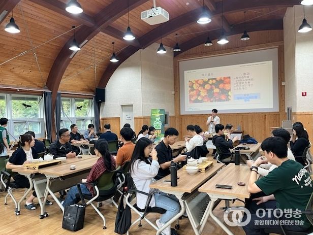 참가자들은 가을이 깊어지는 숲속에서 산림치유지도사와 함께 숲길 걷기, 자연물을 활용한 조별 활동, 싱잉볼 명상, 꽃차 테라피 등 다채로운 쉼 프로그램을 체험하며 긴장을 풀고 안정을 되찾았다.
