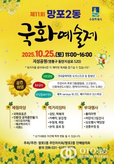 oto방송 김민석 기자 | 수원시 영통구 망포2동 주민자치회는 오는 10월 25일, 영통구 지성공원에서 제11회 국화예술제를 개최한다. 태장동부터 이어져온 이번 축제는 지역주민이 함께 어울리고 즐길 수 있는 참여형 문화행사로 국화포토존, 친환경 공예품만들기 체험부스, 먹거리 장터, 플리마켓 등 다채로운 프로그램이 마련될 예정이다.