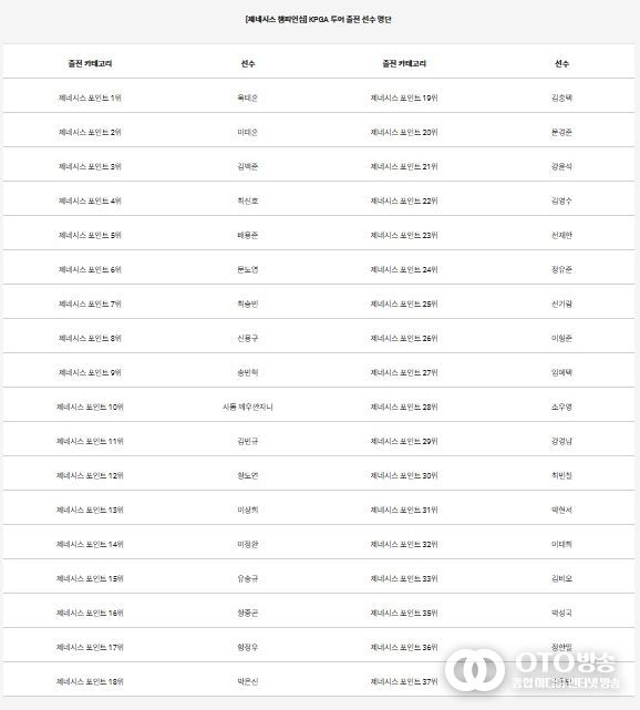 제네시스 포인트 1위 옥태훈(27.금강주택)을 비롯해 2위 이태훈(35.캐나다), 3위 김백준(24.속초아이), 4위 최진호(41.COWELL), 5위 배용준(25.CJ), 6위 문도엽(34.DB손해보험), 7위 최승빈(24.CJ), 8위 신용구(34.금강주택), 9위 송민혁(21.CJ), 10위 사돔 깨우깐자나(27.태국)까지 제네시스 포인트 TOP10 선수들과 36위 정한밀(34.경희), 37위 김동민(27.NH농협은행)까지 제네시스 포인트 상위 36명이 참가자 명단에 이름을 올렸다.