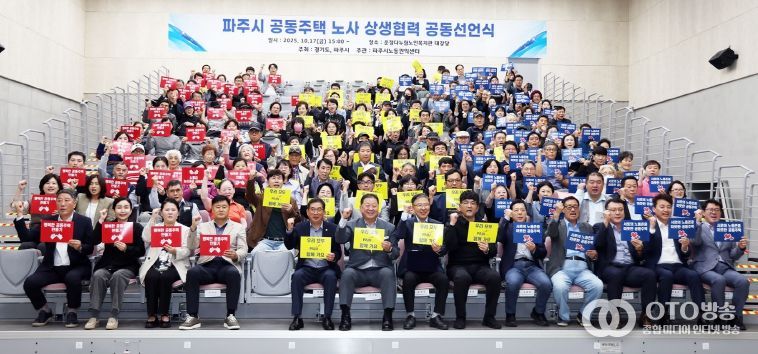 oto방송 김민석 기자 | 아파트 경비원, 미화원 등 공동주택 노동자들의 초단기 계약 관행을 근절하기 위해 경기도와 파주시, 지난 17일 파주시 운정 다누림 노인복지관에서 ‘공동주택 노동자 상생 협력 선언식’을 개최했다.