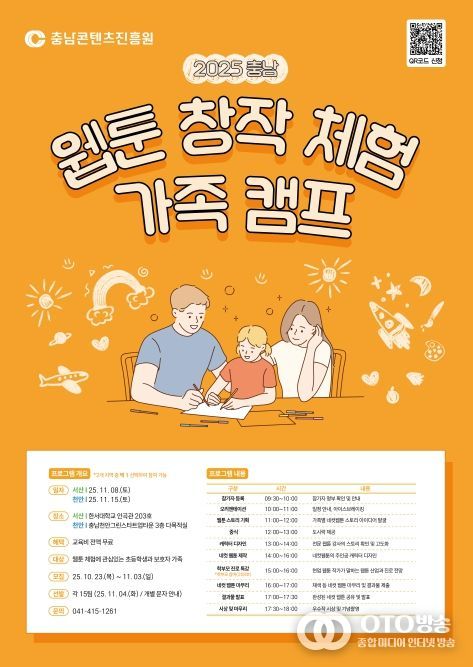 oto방송 김민석 기자 | 충남콘텐츠진흥원은 충남의 웹툰 문화 활성화와 가족이 함께하는 창의적 웹툰 문화체험을 제공하기 위해 ‘2025 충남 웹툰 창작체험 가족 캠프’를 개최한다.