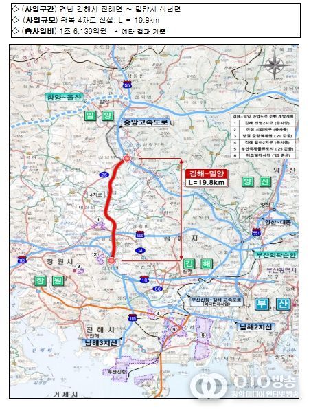 ➊김해~밀양 고속도로 신설은 경남 김해시 진례면 ~ 밀양시 상남면 19.8㎞ 구간 왕복 4차로를 신설하는 사업(총사업비 1.6조원)으로, 부산항신항 및 가덕도신공항의 접근성을 제고하고 대구·경남 지역 산업단지 물류 경쟁력 강화에 기여할 것으로 기대된다.