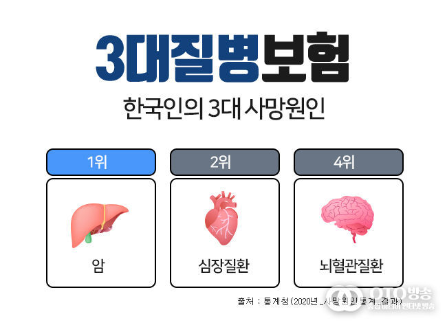 oto방송 김민석 기자 | 흔히 3대질병이라 일컫는 암, 심혈관질환, 뇌혈관질환은 통계청 발표자료에 따르면 한국인의 주요 사망원인 중에서 3위 폐렴을 제외하고 1~4위를 차지하고 있으며, 이전부터 지금까지도 살면서 가장 먼저 대비해야 하는 치명적인 질병으로 강조되고 있다. 이러한 중대질병에 대비하기 위하여 상기 세가지 치명적인 질병을 집중보장하는 3대질병진단비보험을 많이 가입하고 있다. 3대진단비보험은 각각의 질병을 중점적으로 보장하면서도 가입자 특성에 맞는 특약을 추가함으로써 종합건강보험으로도 활용할 수가 있다.
