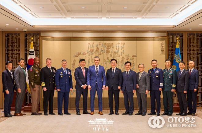 oto방송 김민석 기자 | 이재명 대통령은 11월 4일 오후 대통령실에서 한미안보협의회의(SCM : Security Consultative Meeting) 참석을 위해 한국을 방문한 피트 헤그세스 미국 전쟁부장관의 예방을 받고 한미동맹이 미래형 포괄적 전략동맹으로 심화 발전해 나가는 데 있어 헤그세스 장관의 중요한 역할을 당부했다.