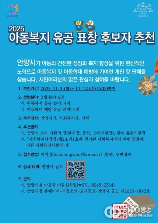 oto방송 김민석 기자 | 안양시는 오는 12일까지 아동의 건전한 성장과 복지 향상에 헌신한 시민과 단체를 발굴 및 격려하고자 ‘아동복지 유공 표창’ 후보자를 추천받는다고 5일 밝혔다.