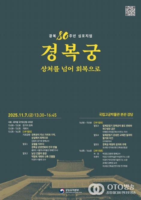 oto방송 김민석 기자 | 국가유산청 궁능유적본부는 광복 80주년을 맞아 11월 7일 오후 1시 30분, 국립고궁박물관 본관 강당에서 '광복 80주년 경복궁, 상처를 넘어 회복으로' 학술 토론회(심포지엄)를 개최한다.