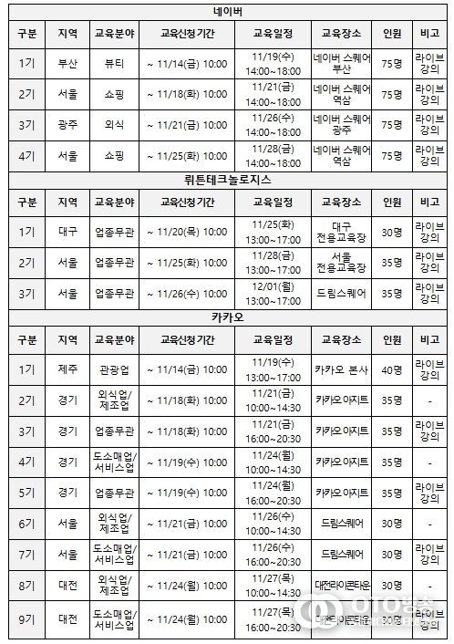 국내의 대표적인 인공지능(AI) 기업인 네이버, 뤼튼테크놀로지스, 카카오(이상 가나다 순)가 교육기관으로 참여하며, 각 기관이 직접 기획한 교육과정(커리큘럼)에 따라 현장 교육과 온라인 교육이 함께 진행될 예정이다.