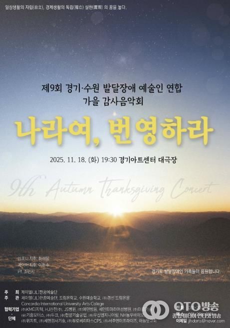 oto방송 김민석 기자 | “나라여, 번영하라”, 우리나라의 안정과 번영을 기원하는 뜻으로 2025년 11월 18일 19시 30분, 경기아트센터 대극장에서 경기.수원 발달장애 예술인들이 연합으로 제9회 가을 감사음악회를 개최한다.