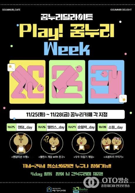 oto방송 김민석 기자 | 의왕시청소년재단 산하 의왕시청소년수련관 꿈누리카페(▲고천점( 문화공원로 33), ▲내손점(복지로 109), ▲오전점(찬우물길 11), ▲백운밸리점(백운중앙로 74, 총 4개 지점))는 오는 11월 25일부터 28일까지 4일간 꿈누리딜라이트 『Play! 꿈누리 Week』를 진행한다고 밝혔다.