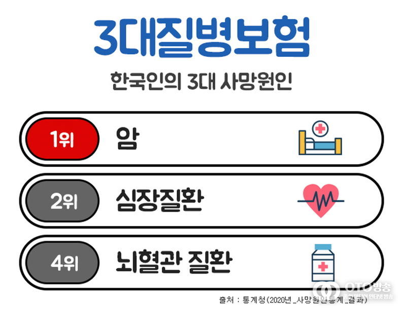oto방송 김민석 기자 | 3대질병으로 일컬어지는 암, 뇌혈관질환, 심혈관질환은 한국인의 주요 사망원인에서 상위를 차지하고 있으며, 이에 대한 진단비를 집중적으로 보장해 주는 보험상품을 3대질병진단비 보험이라 할 수 있다.