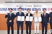 oto방송 김민석 기자 | 충남도가 제110회 전국체육대회 개최지로 최종 선정되면서 도내에서 13년 만에 전국체전을 개최한다. 도는 11일 도청 상황실에서 대한체육회, 도체육회와 함께 ‘2029년 제110회 전국체육대회 개최 업무 협약식’을 열고, 전국체육대회 성공 개최를 위해 손을 맞잡았다. 김태흠 지사와 유승민 대한체육회장, 김영범 도체육회장 등 관계자 10여 명이 참석한 가운데, 이번 행사는 간담회, 협약서 서명 등의 순으로 진행했다. 이번 협약에 따라 세 기관은 △2029년 전국체육대회, 2030년 전국소년체육대회, 2031년 전국생활체육대축전 개최 △경기장 시설 개·보수 등 대회 준비에 협력한다. 제110회 전국체육대회 유치를 위해 도는 지난 2월 도체육회를 통해 대한체육회에 유치 신청서를 제출했으며, 대한체육회는 7월 전국종합체육대회위원회 예비 심사와 8월 이사회 의결을 거쳐 충남을 개최지로 확정했다. 제110회 전국체육대회는 오는 2029년 10월 중 7일간 도내 15개 시군 전역에서 열리며, 전국에서 3만 여명의 선수단이 참가할 것으로 예상된다. 주 개최지