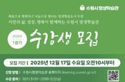 oto방송 김민석 기자 | 수원시평생학습관이 12월 17일 오전 10시부터 2026년 1분기 수강생을 모집한다. 1월부터 3월까지 운영되는 1분기 강좌는 ▲첨단미래기술 프로그램 ▲디지털 지식정보 프로그램 ▲생활문화 프로그램 ▲교양 프로그램 ▲인문 프로그램 ▲기관 협력 재능기부 프로그램 ▲거북이공방 프로그램 ▲대상별 맞춤프로그램 ▲시민교육 프로그램 ▲언제든학교 시민기획 프로그램 ▲무지한스승의만남 시민참여기획 프로그램 등 총 11개 과정, 115개 세부 강좌로 구성됐다. 첨단미래 기술 프로그램을 강화했다. 인공지능(AI) 기술에 초점을 둔 첨단미래기술 프로그램, 성균관대학교 지능로봇리빙랩과의 협업을 통한 자율주행 실습, 가상현실(VR)드론 시뮬레이션 체험 등이 있다. 또 글쓰기, 사주명리학, 한글 서예, 현대미술, 명화감상, 뮤지컬 등을 주제로 한 교양 프로그램과 중장년, 시니어, 제2의 인생설계, 청소년 등을 대상으로 하는 대상별 맞춤 프로그램을 마련했다. 수원시는 새빛톡톡 시민 설문조사를 활용해 2026년 강사를 공개 모집했고, ▲생활문화 프로그램 ▲디지털 지식정보 프로그램 ▲대상별 맞춤프로그램