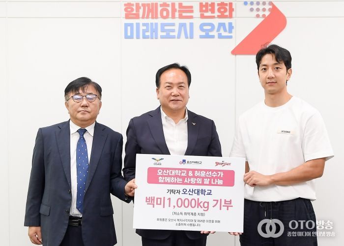 oto방송 김민석 기자 | 오산시는 16일 오산시청에서 오산대학교와 수원KT소닉붐 허훈 선수와 함께하는 3점 슛 기부챌린지로 적립한 금액 3백만 원(백미 10kg 100포)을 취약계층을 위해 기탁했다.