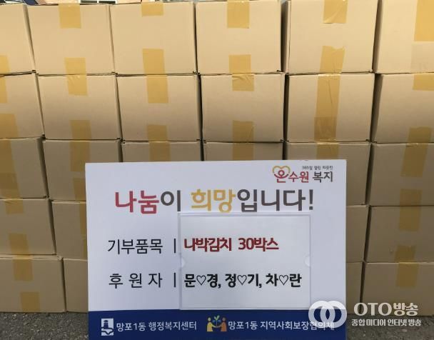 문♡경, 정♡기, 차♡란 후원자 3명은 “서로 도우며 살아야 한다는 평소 신념대로 내가 가진 아주 작은 것을 나누었을 뿐이다. 나박김치 드시면서 추운날씨지만 따뜻하게 겨울 보내셨으면 좋겠다”고 말했다.