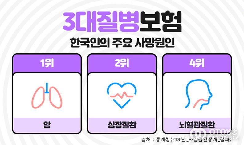 oto방송 김민석 기자 | 한국인의 주요 사망원인중에 암, 뇌혈관질환, 심혈관질환은 흔히 3대질병이라 일컬어지며 살아가면서 가장 먼저 대비해야 하는 중대질병으로 항상 강조되고 있다. 이들 질병에 미리 대비하기 위해 가입하는 것이 진단비보험인데, 이러한 3대질병진단비를 중점으로 보장하는 보장성보험이 3대진단비보험 이다. 3대질병진단비보험은 각각의 질병에 주목해서 보장하기도 하지만, 나에게 맞는 추가 특약을 잘 골라서 가입한다면 종합건강보험으로도 충분히 활용도가 높다.