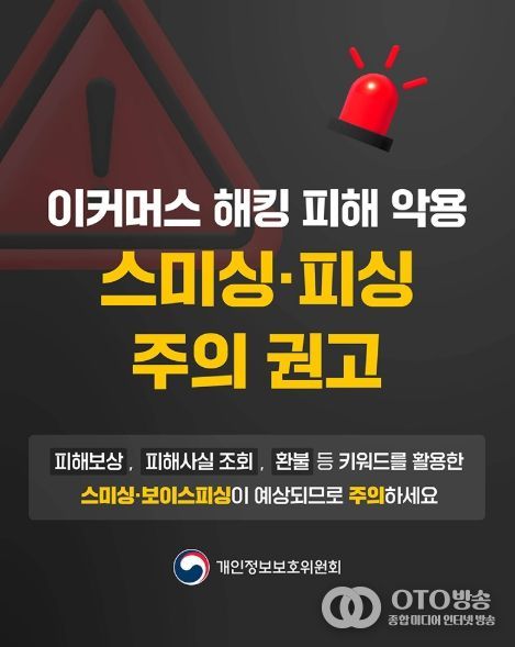 oto방송 김민석 기자 | 이커머스 해킹 피해 악용 스미싱·피싱 주의 권고 피해보상, 피해사실 조회, 환불 등 키워드를 활용한 스미싱·보이스피싱이 예상되므로 주의하세요.