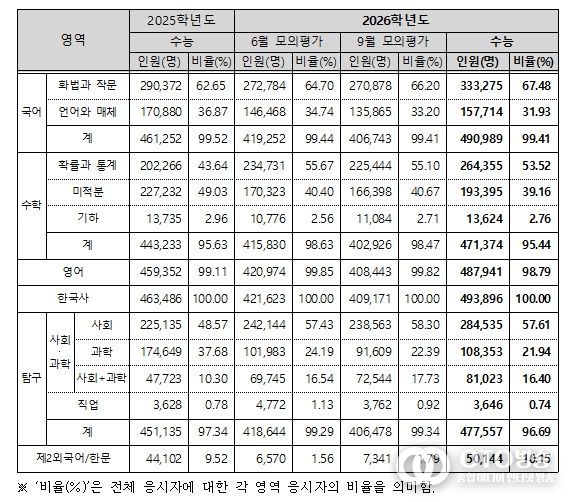 2026학년도 수능에 응시한 수험생은 493,896명으로 재학생은 333,102명, 졸업생과 검정고시 합격자 등은 160,794명이었다.